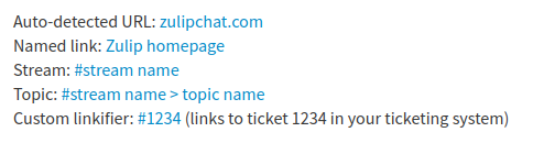 Zulip auto-linkifies URLs and valid stream names. You can also add a